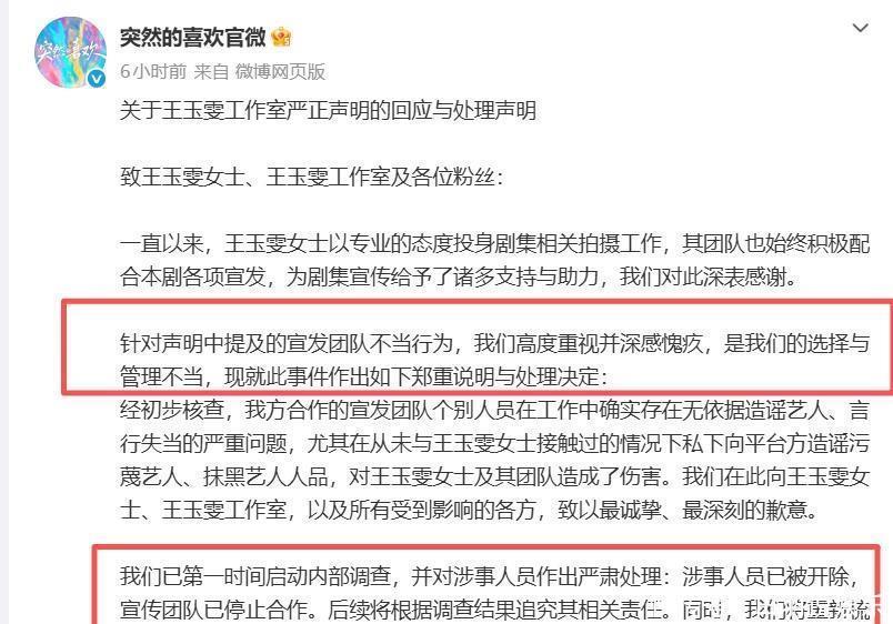 数个小时后,《突然的喜欢》的官微紧急发布长文致歉,并给出了对该事件的处理方式:涉事人员已被开除,宣传团队已停止合作。后续将根据调查结果追究其相关责任。同时,我们将重新梳理宣发流程,确保后续所有工作严谨合规开展。
